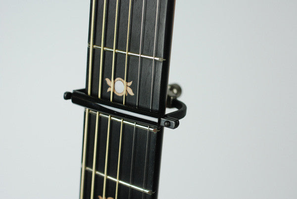Black anodized steel capo w/ locking crossbar & adjustable thumb screw. Long wear, no buzz. Crossbar slightly angled to compensate for string size difference. Thumb screw pulls from center to give even pressure on all strings.