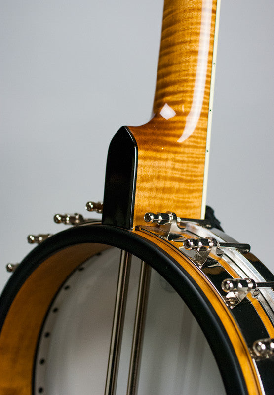 The tubaphone tone ring creates that unique Vega tone in this professional quality maple banjo. The Vega No.2 is a top grade banjo made of curly maple stained light amber and buffed to a high gloss. The dimensions of the neck are quite similar to the early Vega banjos; full, yet fast and comfortable. We make genuine Vega Tubaphone tone rings of brass to create a beautiful quality of tone and projection. We precisely fit the tubaphone tone ring to the 3-ply violin grade Maple Rim, which we also fit with a brass bracket band and frosted top head to create a crisp tone for all styles of music.